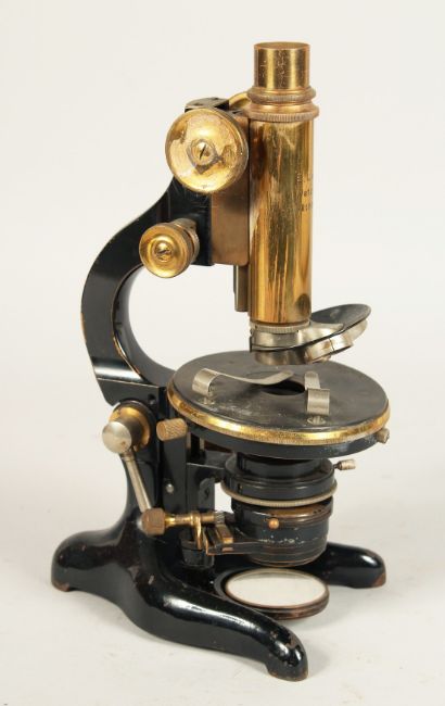 AN E. LEITZ WETZLAR BLACK AND BRASS MICROSCOPE. No. 2186512, in a mahogany case.