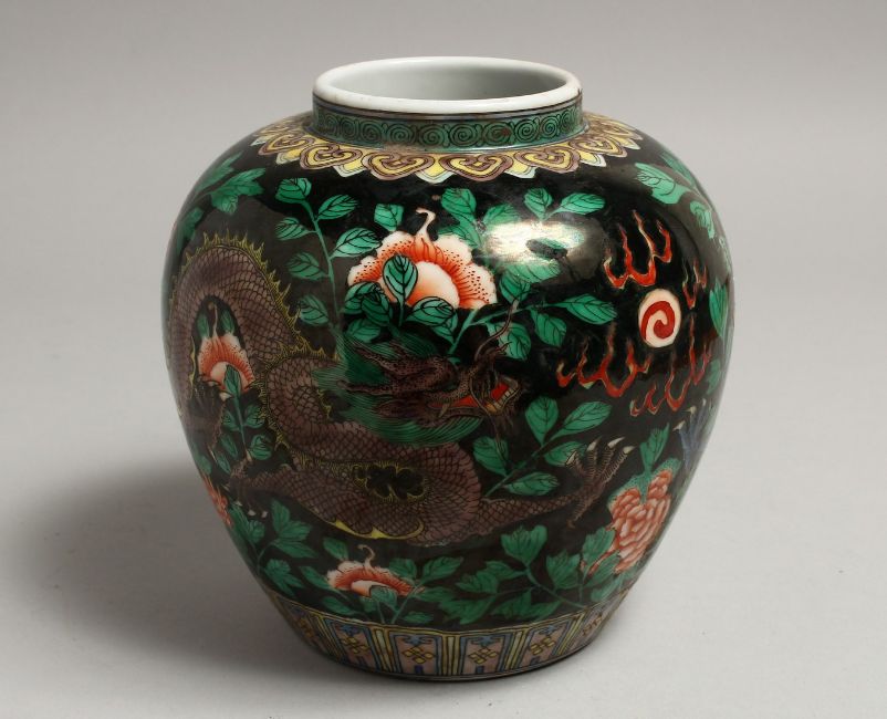 A CHINESE FAMILLE NOIR VASE painted with a dragon design.