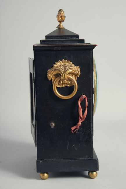 A GOOD SMALL REGENCY EBONISED BRACKET CLOCK by ROSSITER, BRIDGEWATER, with silver dial, brass inlay, and brass handles with pineapple finials.