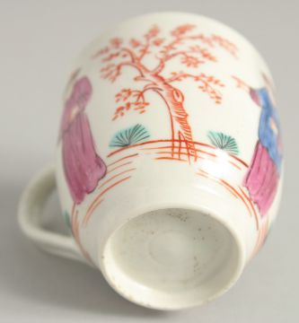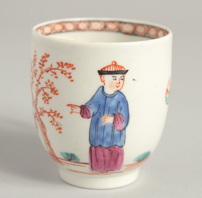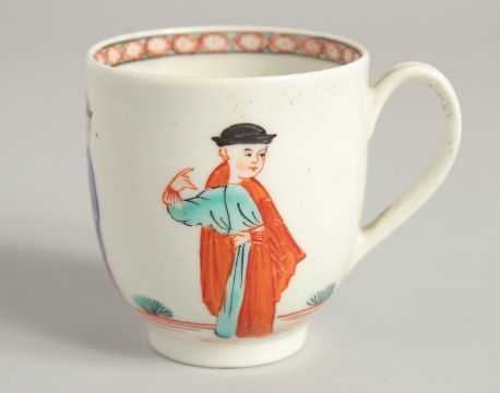 AN 18TH CENTURY WORCESTER COFFEE CUP painted with three Oriental figures and an inner cell border, in a polychrome palette.