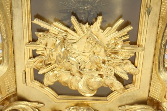 The eight-day movement striking on a bell, with porcelain dial and separate numerals, in an ormolu case mounted with cupids holding an hourglass, the corners as female caryatid figures, the glazed door mounted with a horse drawn chariot on legs and harebell supports with four feet, the whole on a shaped platform base.