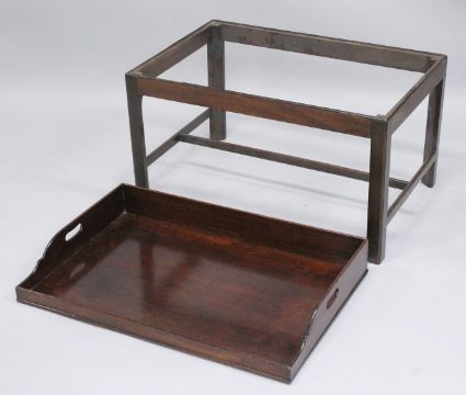 A 19TH/ 20TH CENTURY MAHOGANY BUTLERS TRAY on stand.