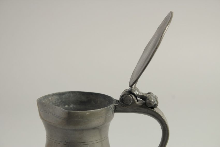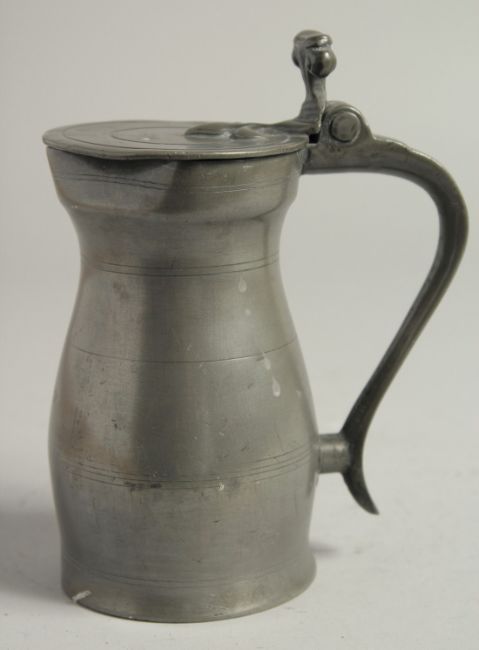 AN 18TH CENTURY PEWTER MEASURE AND COVER.