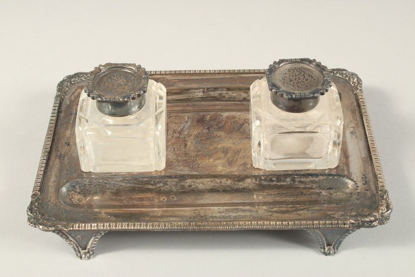 A RECTANGULAR TWO BOTTLE INKSTAND