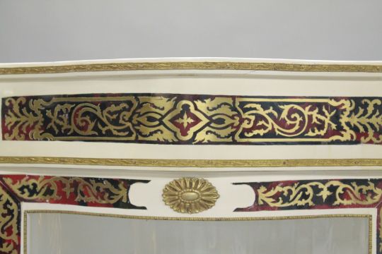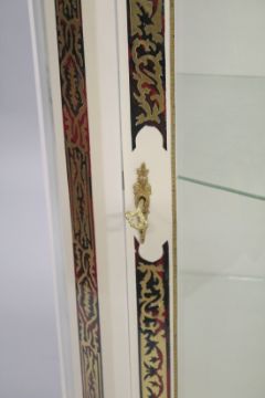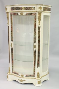 A FRENCH STYLE WHITE PAINTED STANDING DISPLAY CABINET of 'Serpentine outline inset with "Boulle" style panels.