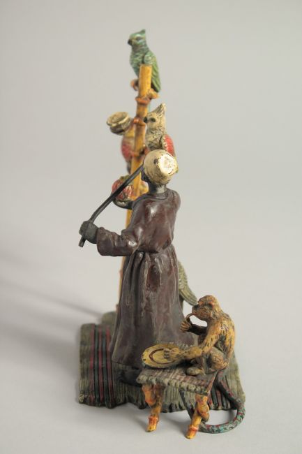 A VIENNA PAINTED BRONZE PARROT SELLER with parrots, owl, and monkey by his side.