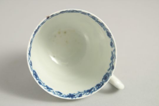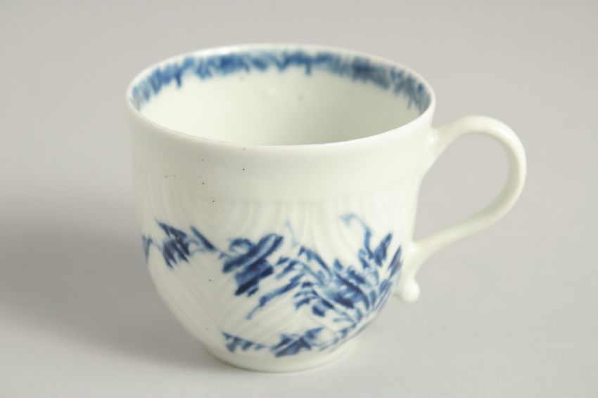 TWO 18TH CENTURY WORCESTER TWO FEATHER MOULDED COFFEE CUPS, one with a rare, shaped handle and work man's mark the other with a crescent mark.