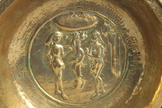 A 17TH CENTURY BRASS ADAM AND EVE CIRCULAR ALMS DISH.