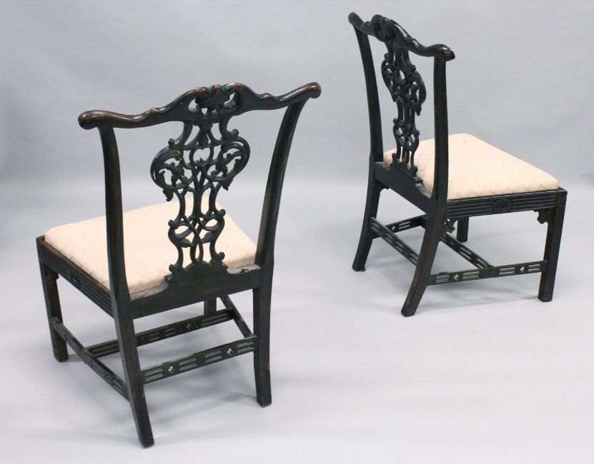 A VERY GOOD PAIR OF 19TH CENTURY CHIPPENDALE MAHOGANY SINGLE CHAIRS with pierced vase splats, drop in seat and fluted legs.