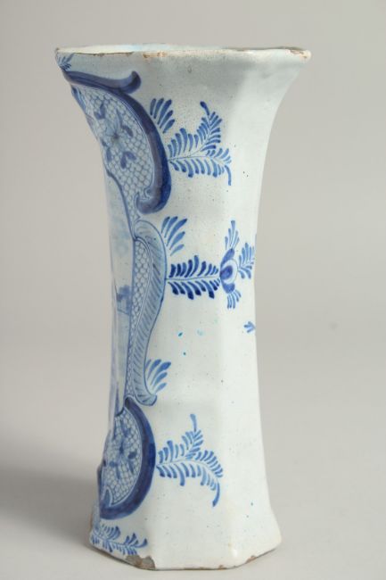 A DUTCH BLUE AND WHITE TIN GLAZE VASE with figures in a landscape.