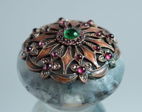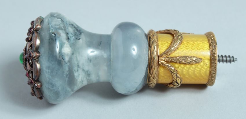 A SUPERB RUSSIAN SILVER, MOSS AGATE, AND ENAMEL HANDLE set with cabochon stones. 9cm long, in a Faberge box.