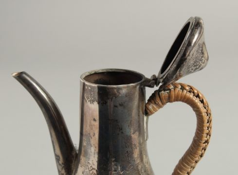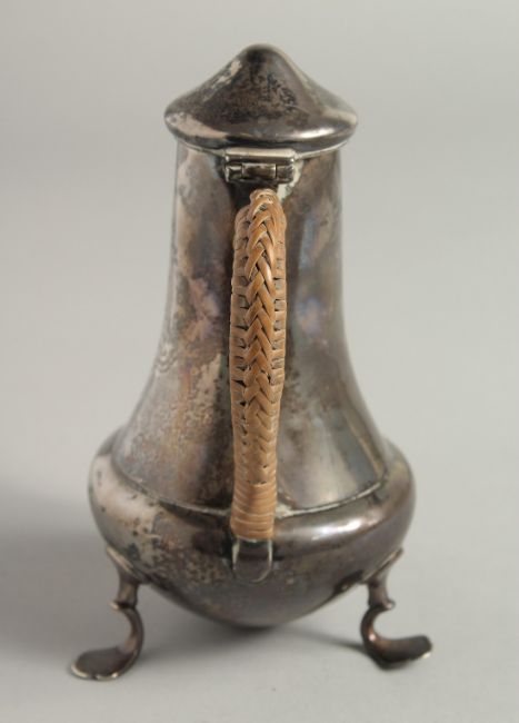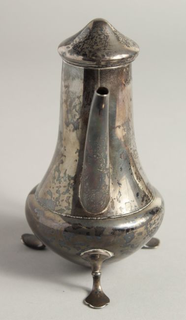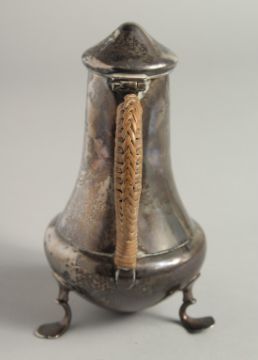 A SMALL COFFEE POT with wick handle on three pad feet.