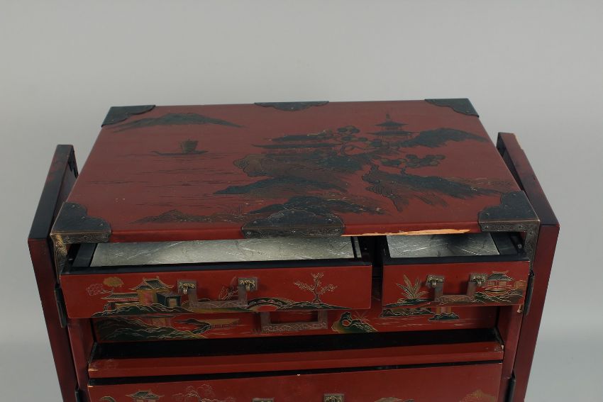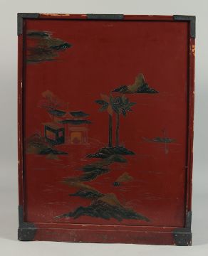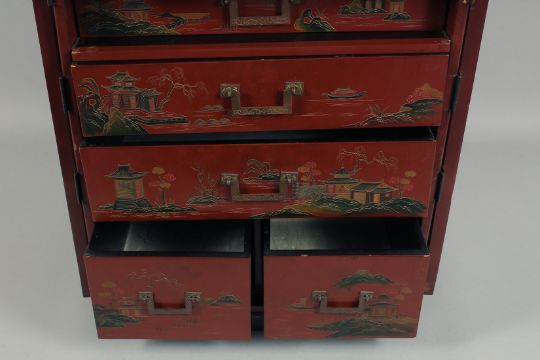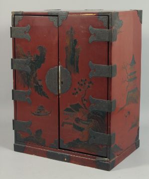 A JAPANESE RED LACQUERED TWO DOOR CABINET.