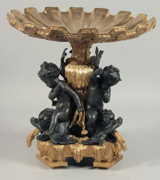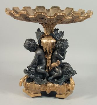 A GOOD ONYX AND BRONZE CHINESE STYLE TAZZA held by three cherubs.