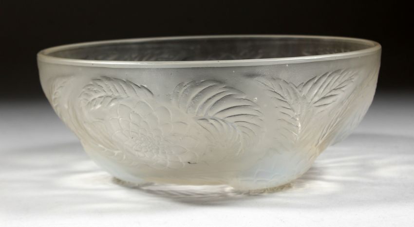 A LALIQUE CIRCULAR BOWL with flowers in iridescent blue. 9ins diameter.