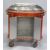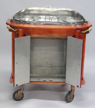 AN UNUSUAL FRENCH STYLE COPPER, BRASS AND LACQUERED WOOD HOTEL STYLE SERVING TROLLEY.
