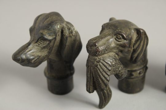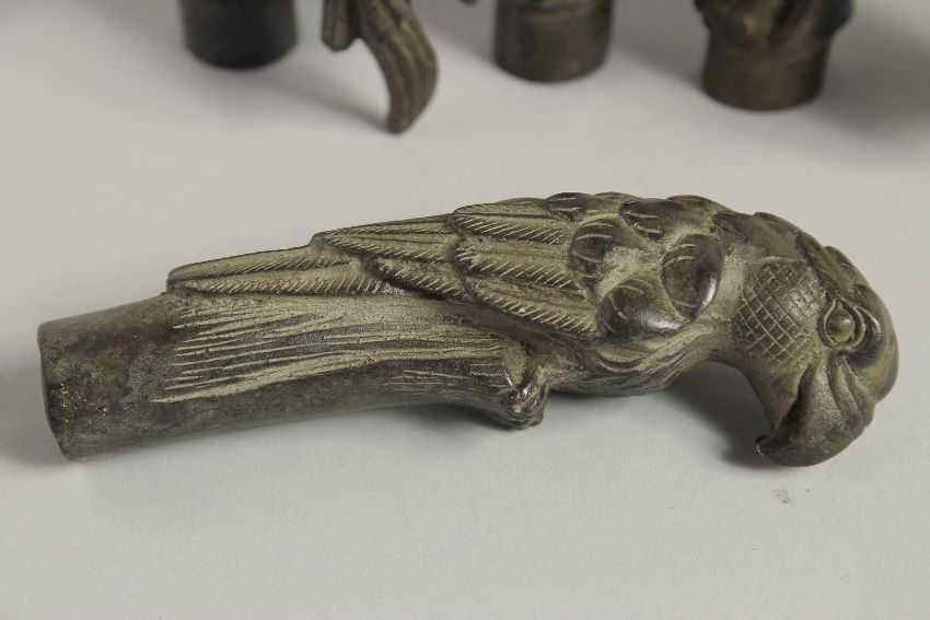 FIVE VARIOUS BRONZE WALKING STICK HANDLES, SKULL, HEAD, PARROT, AND DOGS.