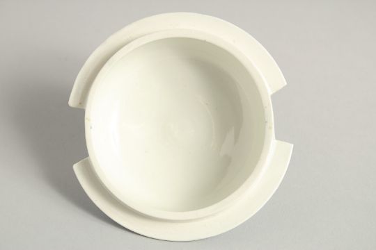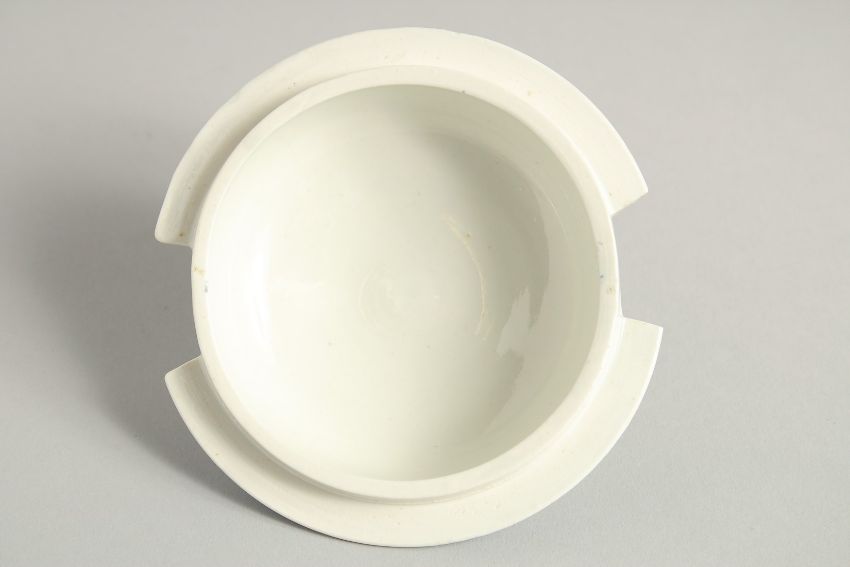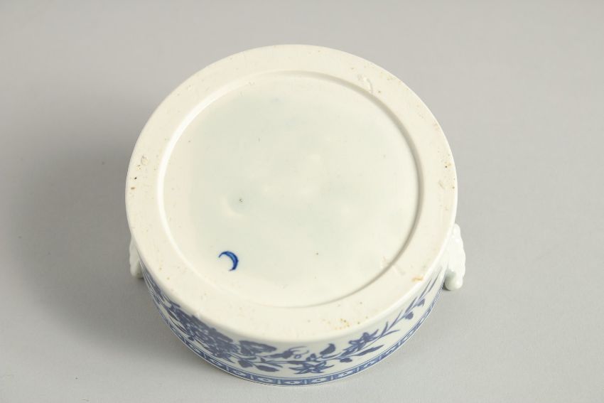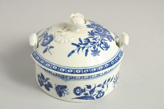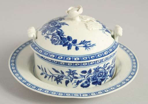 AN 18TH CENTURY WORCESTER BUTTER TUB COVER AND STAND printed with floral sprays, crescent mark.