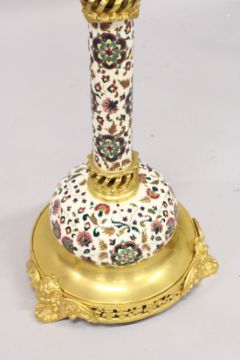 A GOOD RARE ZOLNEY PORCELAIN AND GILDED METAL STANDING LAMP painted with flowers.