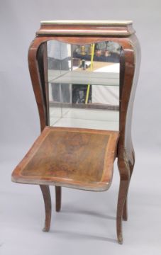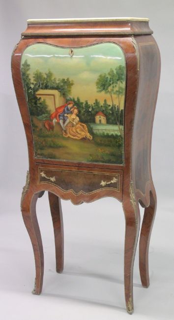 A FRENCH STYLE MAHOGANY AND MARBLE TOP SECRETAIRE CABINET the fall front painted with a "verni Martin" style scene, on cabriole legs.