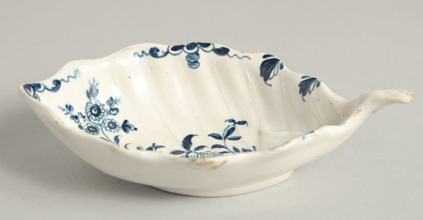AN 18TH CENTURY LOWESTOFT LEAF SHAPED DISH, moulded with a leaf and veins of unusually large size, painted with flowers.
