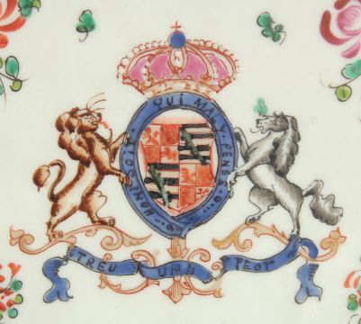 A SAMSON FAMILLE ROSE PIE-CRUST ARMORIAL DISH. 6ins diameter.