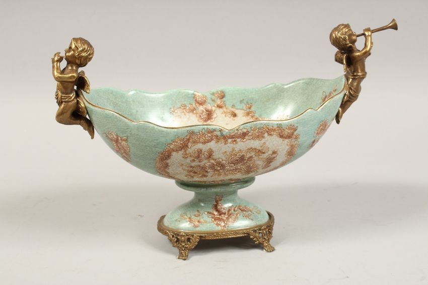 AN OVAL PORCELAIN BOWL with gilt cherubs handles and base.