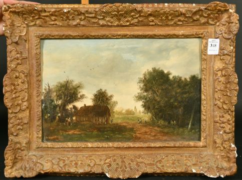 Dutch School, 19th Century, wayfarers on a country path with a church tower beyond, oil on oak panel, indistinctly signed with initials, 9" x 13" (23 x 33cm).