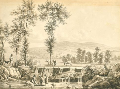German School (19th Century) Figures in an extensive landscape with cattle and dogs, pen and ink with wash, 9.5" x 12.5", (24x32cm) (unframed).