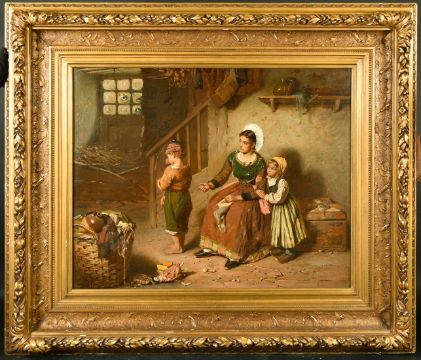 19th Century Italian School, a young mother and her children in a rustic interior, oil on canvas, 29" x 36" (73 x 92cm), in a fine gilt composition frame.