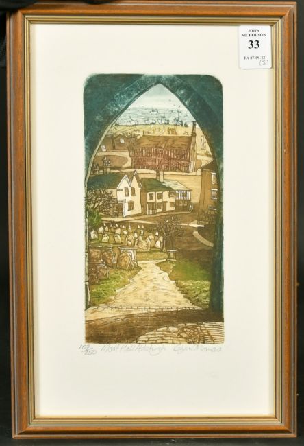 Glynn Thomas (b.1946), 'Moot Hall Aldeburgh', coloured etching, signed and inscribed, 8" x 3.75" (20 x 9cm), along with another similar 'Fish and Chips' also signed, 4.75" x 2.5" (12 x 7cm), and another by a different hand, 'Sleepy Heads', 4.75" x 3" (12 x 7.5cm) (3).