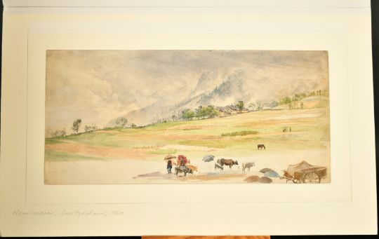 James Duffield Harding (1793-1863) 'Near Lucerne, Switzerland', figures holding parasols with cattle and cart a mountain landscape, watercolour and pencil, titled under mount and dated 1860, label verso, 9.5" x 19.75", (24x50cm) (unframed).