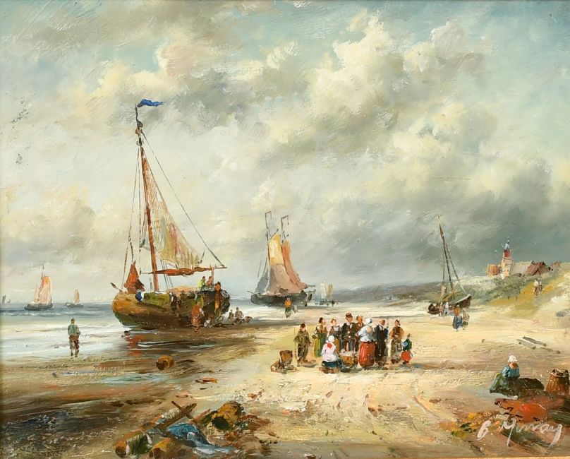 Brian Murray (b. 1918), figures gathered on a beach, signed, 8" x 10", (20x35.5cm).
