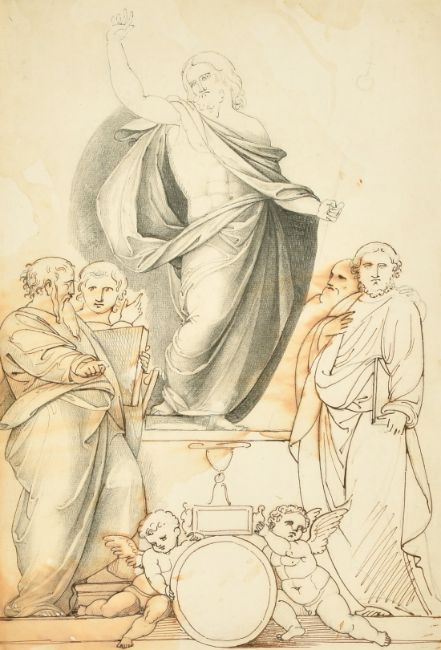 Samuel Woodforde (1763-1817) A bookplate design with Fra Bartolomeo's Christ with the Evangelists, pen, ink and grey wash, label verso, 13.25" x 9", (33.5x23cm) (unframed).