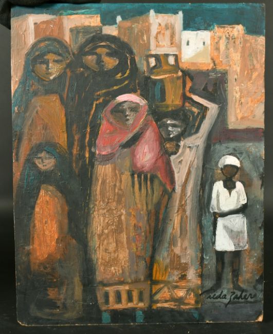20th Century North African School, figures in a street, oil on board, indistinctly signed, 15.75" x 12" (40 x 31), (unframed).