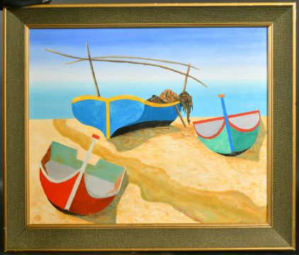 Ronald Bird (20th Century), colourful boats in a beach, oil on canvas, signed with initials, 20" x 24" (51 x 61cm).
