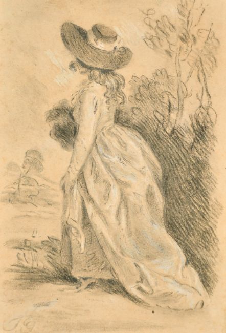 Follower of Thomas Gainsborough, A lady in a landscape, charcoal with white heightening, bears initials, 8" x 5.5", (20x14cm) (unframed).