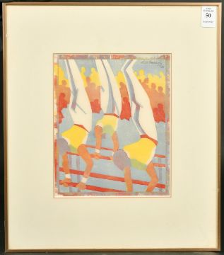 Lill Tschudi (1911-2004) gymnasts on parallel bars, linocut, signed and numbered 10/50, 8.25" x 7" (21 x 17cm).