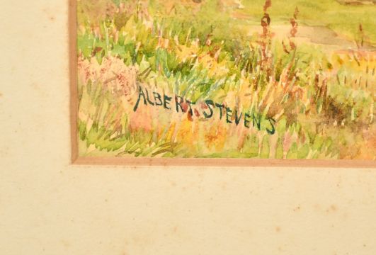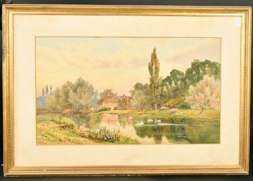 Albert George Stevens (1863-1927) British, swans gathered mid-river with a cottage beyond, watercolour, signed, 15.5" x 27" (39 x 68cm).