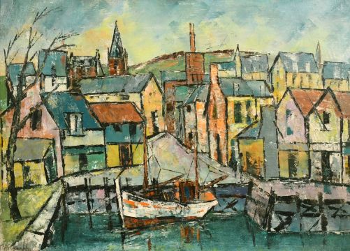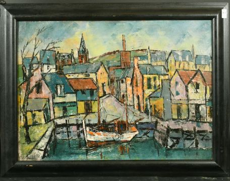 20th Century School, Fishing boat in a town port, oil on canvas, indistinctly signed, 20" x 28", (51x71cm).
