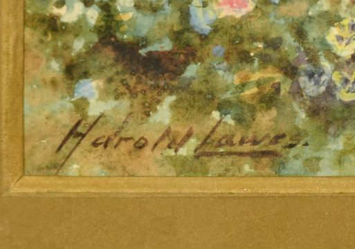 Harold Lawes (1865 - 1940) British, a lady tending flowers in a cottage garden, watercolour, signed, 14" x 10" (36 x 26cm), along with another similar by the same hand, 10" x 14" (26 x 36cm), (2).