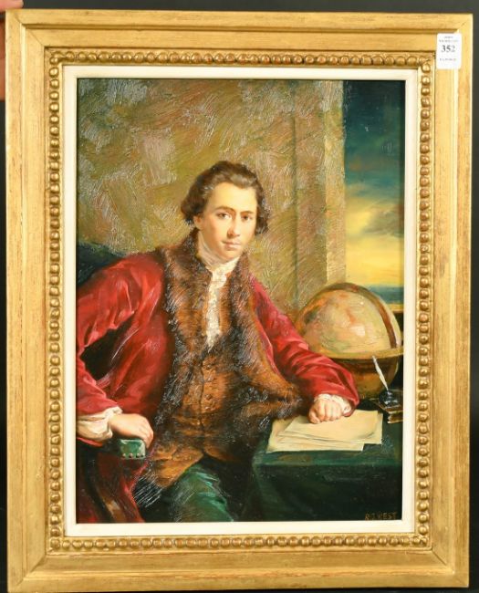 R.J. West (20th Century) A portrait of a gentleman seated at a table with a globe, ink pot and papers, oil on board 12" x 16", (30.5x40.5cm).