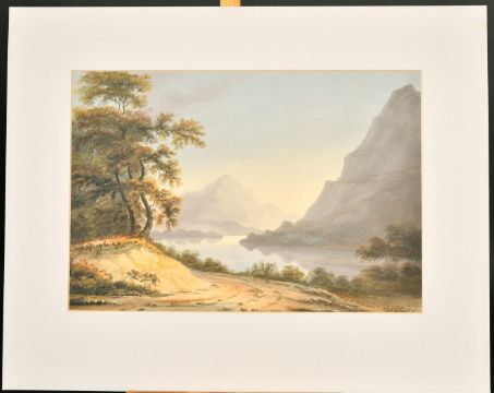Circle of William Turner of Oxford, Highland Lake scene at sunset, watercolour, 10" x 14.5", (25.5x36.5cm) (unframed).