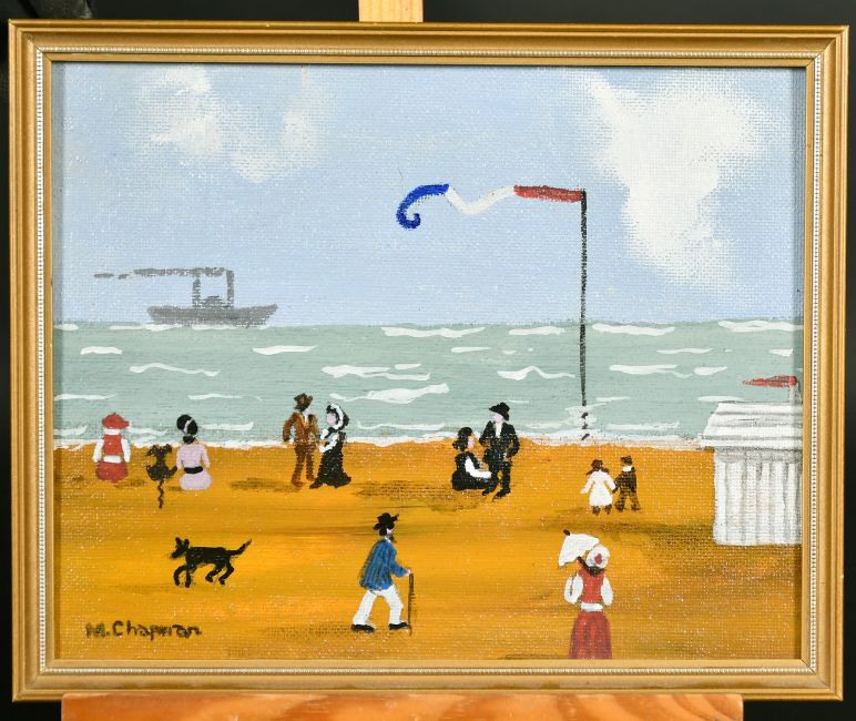 Margaret Chapman (1940-2000) British, Figures and dogs on a French beach with a paddle steamer ship beyond, oil on board, signed, 8"x 10", (20x25.5cm).