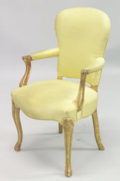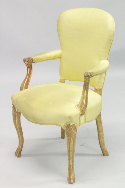 A PAIR OF FRENCH HEPPLEWHITE GILDED ARMCHAIRS with yellow padded backs and seats.