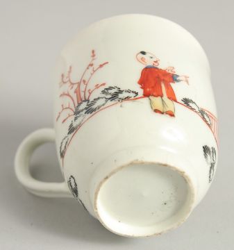 AN 18TH CENTURY WORCESTER COFFEE CUP painted in colour with three Oriental figures.