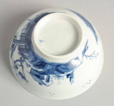 AN EARLY 18TH CENTURY WORCESTER BOWL finely painted in underglaze blue with the Gazebo pattern.