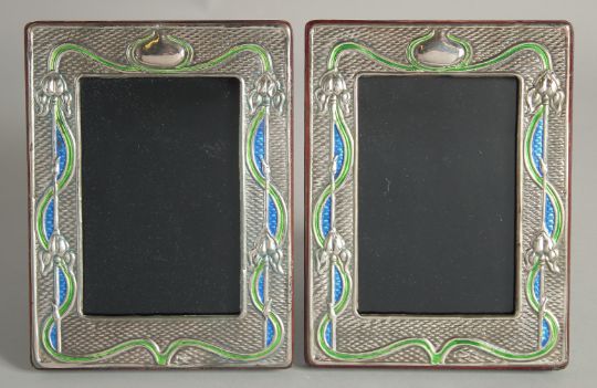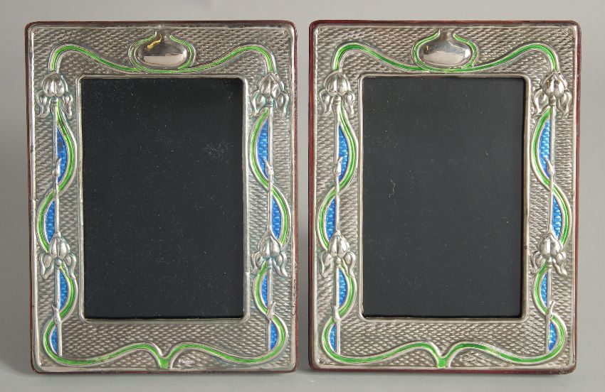 A PAIR OF SILVER AND ENAMEL PHOTOGRAPH FRAMES.