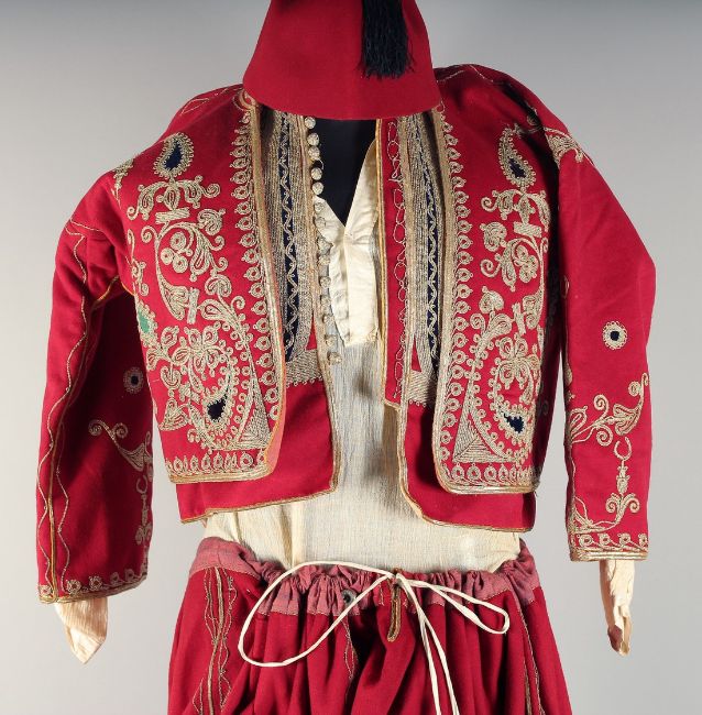 A COMPLETE TURKISH OTTOMAN EMBROIDERED MEN'S OUTFIT, including jacket, waistcoat, shirt, trousers, hat and shoes, (six components; including pair of shoes).