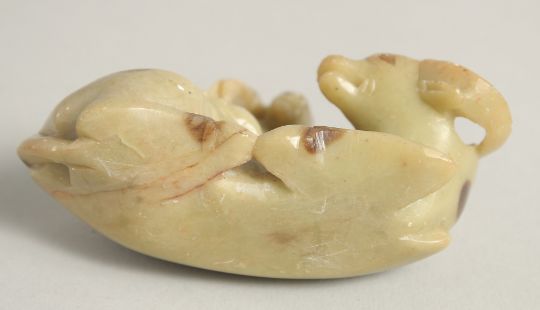 A SMALL CHINESE CARVED SOAPSTONE GROUP, depicting a figure on an oxen, 9cm long.